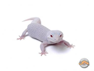 The Diablo Blanco is a visually stunning morph that displays a stark white, patternless body and tail and contrasted with beautiful ruby red eyes. This combination morph was first created in 2006 and combines the genes from the Blizzard and RAPTOR morphs – which broken down one step further is the combination of Blizzards, Tremper Albinos, Tremper Eclipse, and Patternless Stripe – all of which are recessive genetic traits.